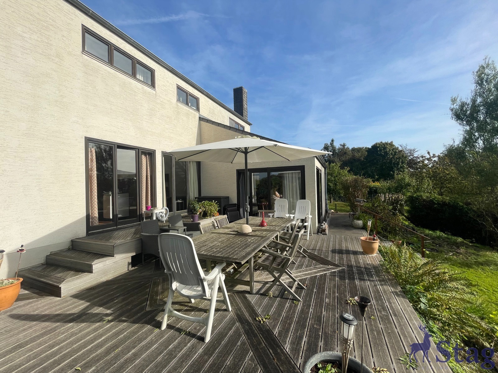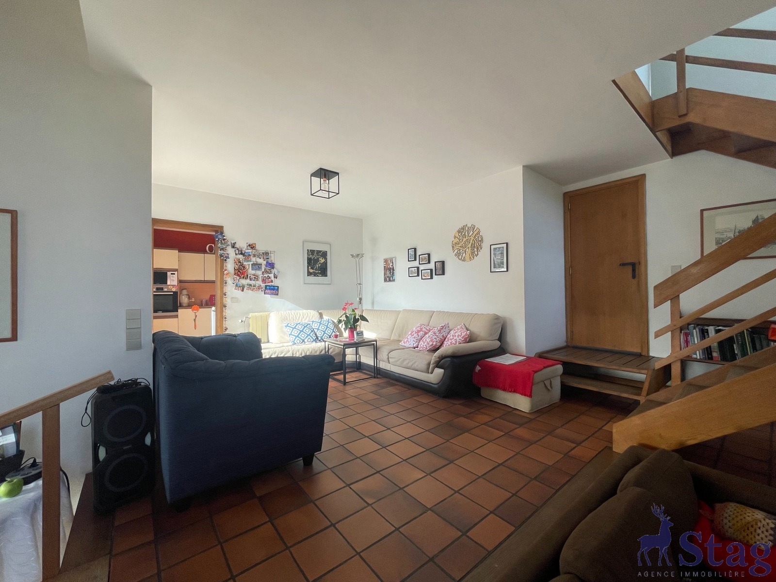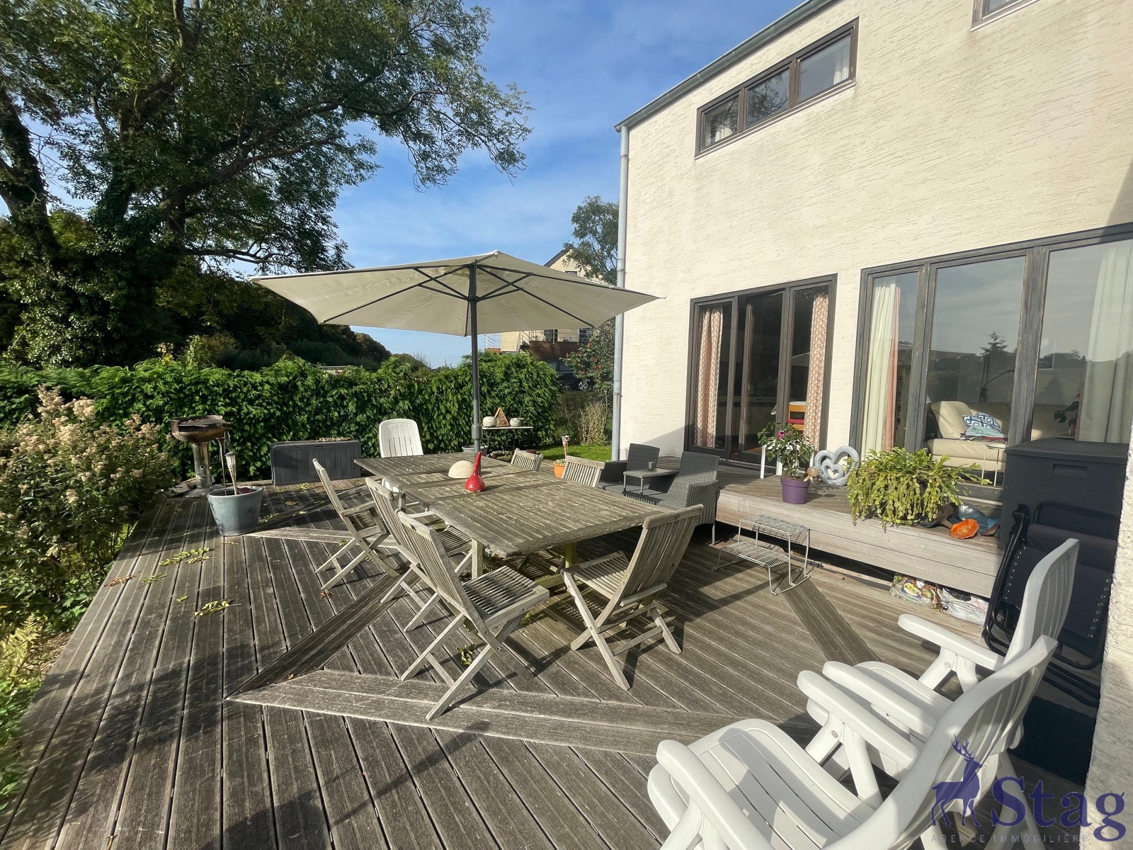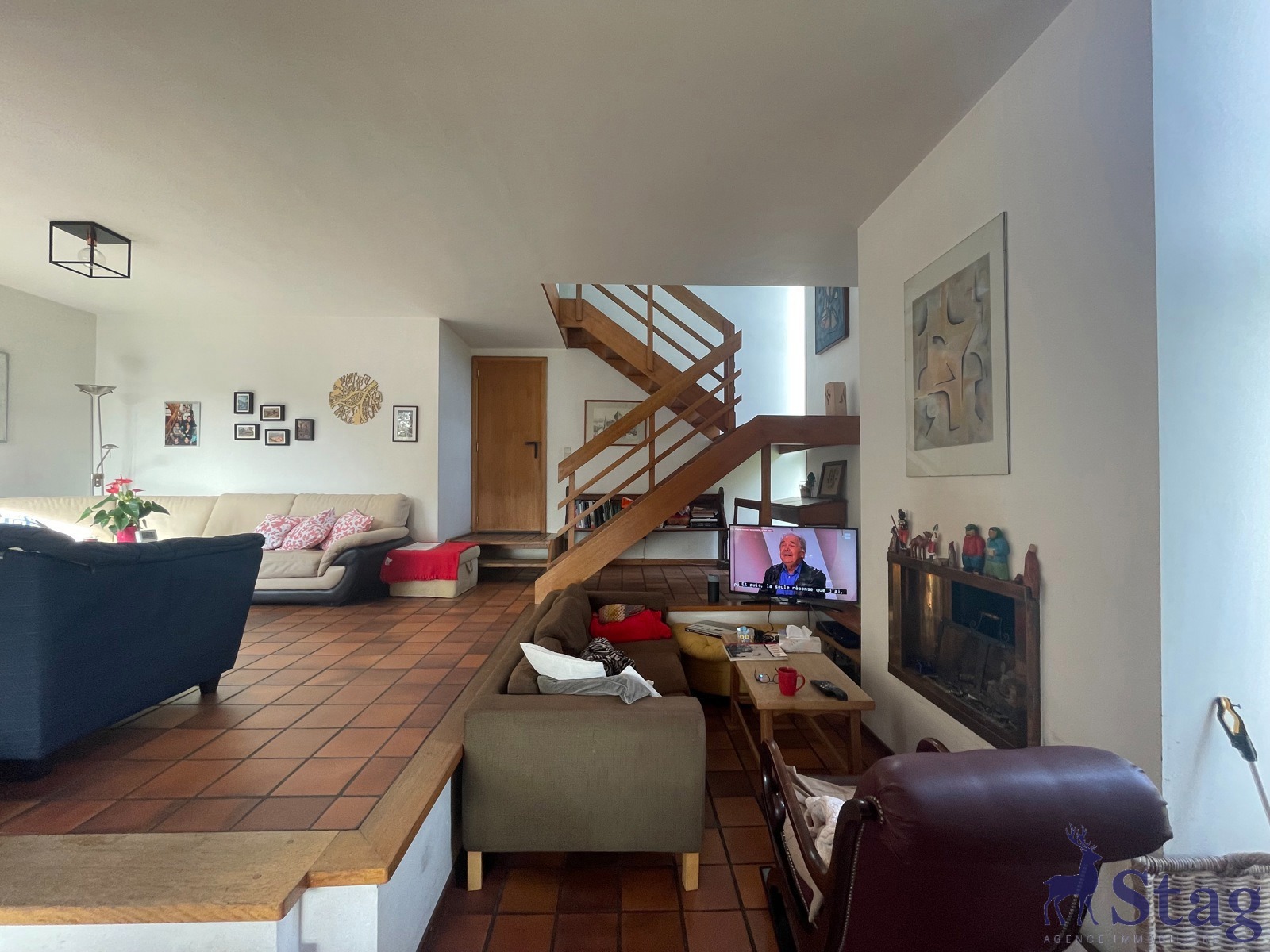 Le bien se compose comme suit: Au rez-de-chaussée: hall d’entrée avec coin vestiaire, spacieux et lumineux espace séjour organisé sur différents niveaux avec feu ouvert, grandes baies vitrées donnant sur une grande terrasse de 64m², cuisine équipée avec porte fenêtre donnant accès à la terrasse, buanderie, chambre (bureau) et toilette.